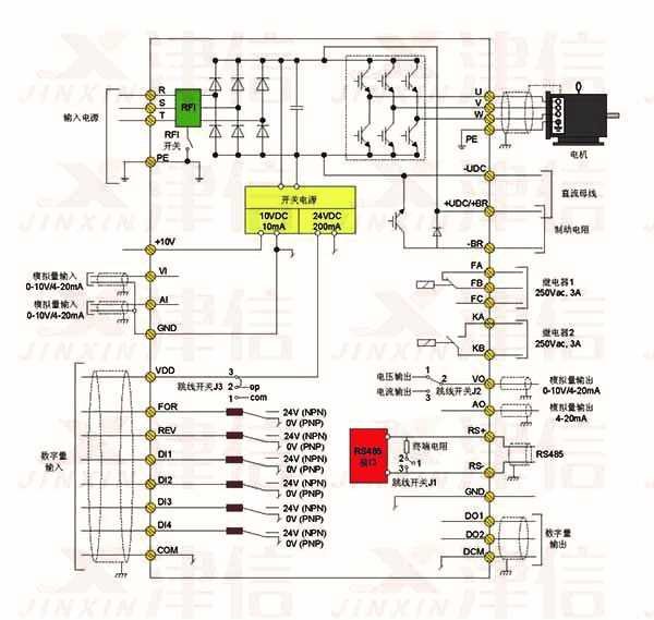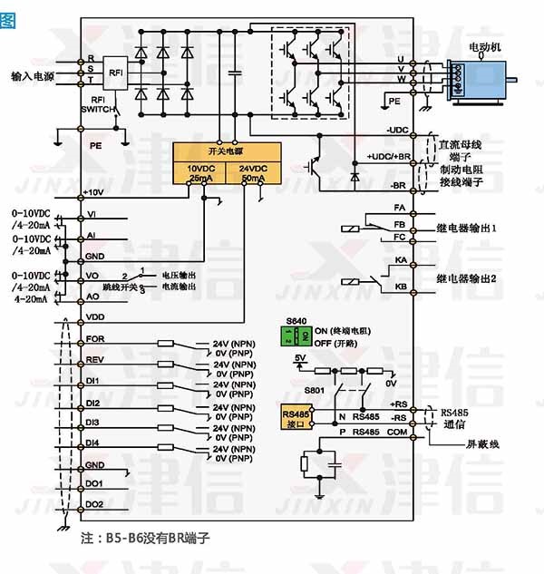 5. 保護端子:用于連接保護裝置,如制動電阻端子,接地端子等。