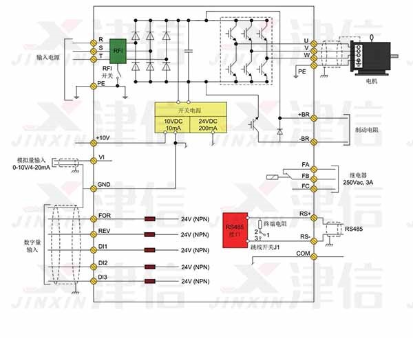 3. 控制信號端子:用于連接控制信號,如啟動、停止、正轉、反轉等,通常連接的是+24V,com和數字量多功能定義端子。