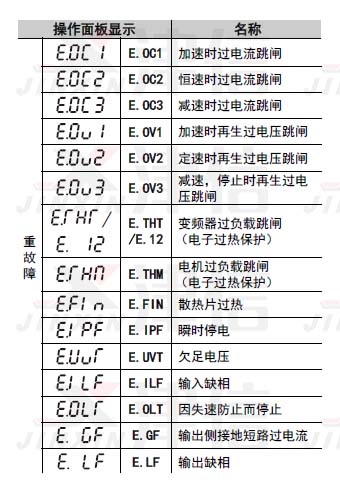 三菱變頻器重故障包括:E.OC1,E.OC2,E.OC3,E.OV1,E.OV2,E.OV3,E.THT,E.12,E.THM,E.FIN,E.IPF,E.UVT,E.ILF,E.OLT,E.GF,E.LF