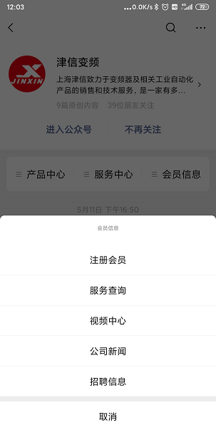第一步,掃描二維碼,關(guān)注上海津信微信公眾號(hào),公眾號(hào)包括產(chǎn)品中心,服務(wù)中心和會(huì)員信息三個(gè)主菜單。