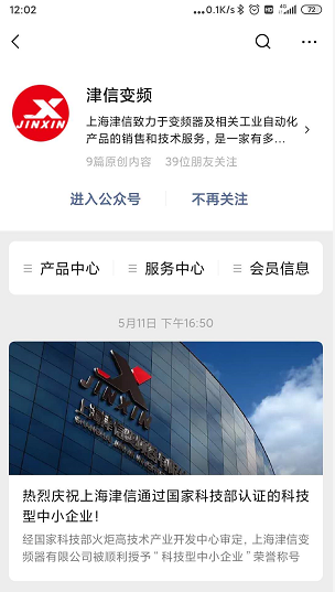 津信變頻微信公眾號(hào)推出以來,一直得到廣大用戶的歡迎和好評(píng),用戶不但可以從微信公眾號(hào)獲得豐富的產(chǎn)品和技術(shù)信息,還可以獲得及時(shí)的在線服務(wù)。