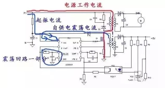 2、開關電源出現(xiàn)間歇振蕩,能聽到“打嗝”或者“吱吱”聲,操作面板時亮時熄,這是因為負載電路異常,導致電源過載,引發(fā)過流保護電路動作的典型故障特征,負載電流異常上升,引起一次繞組激磁電流大幅上升,在電流采樣電阻R4形成1V以上的電壓信號,使UC3844內(nèi)部電流檢測電路起控,電路停震;R4上過流信號消失,電路又重新起振,如此循環(huán)往復,出現(xiàn)間歇振蕩。