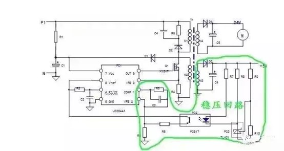 - 對UC3844單獨上電,短接PC2輸入側(cè),若電路起振,說明故障在PC2輸入側(cè)外圍電路;電路不起振則檢查輸出側(cè)電路。