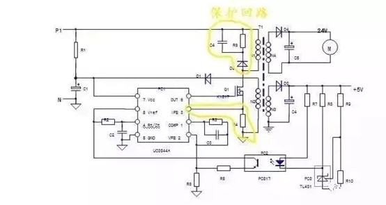 3、保護回路:PC1芯片本身和3腳外圍元件R4構(gòu)成過電流保護回路;N1繞組上并聯(lián)的D2,R6,C4元件構(gòu)成了開關管的反壓吸收保護電路;實質(zhì)上穩(wěn)壓回路的電壓反饋信號——穩(wěn)壓信號,也可看作一路電壓保護信號,但保護電路的內(nèi)容并不僅是局限于保護電路本身,保護電路的啟控往往是由于負載電路異常所引起的。